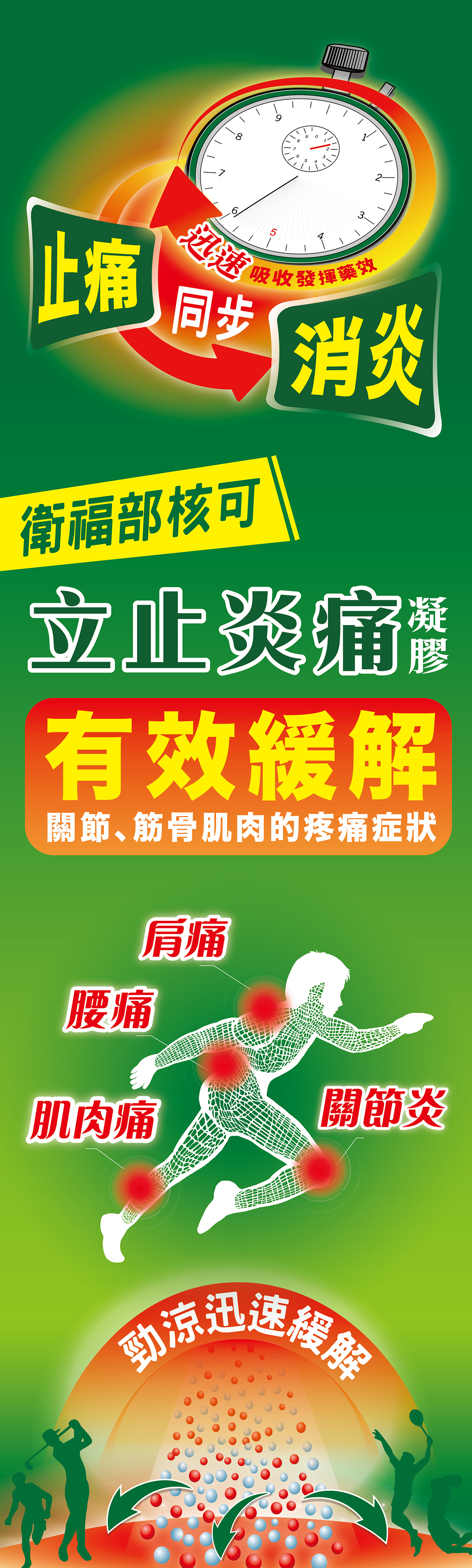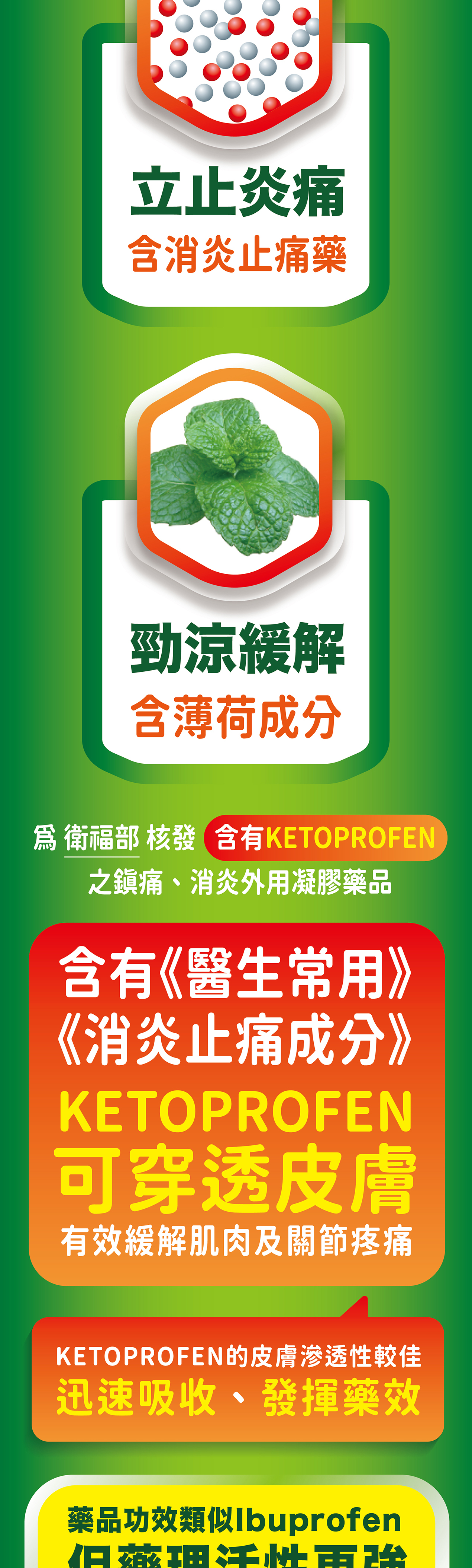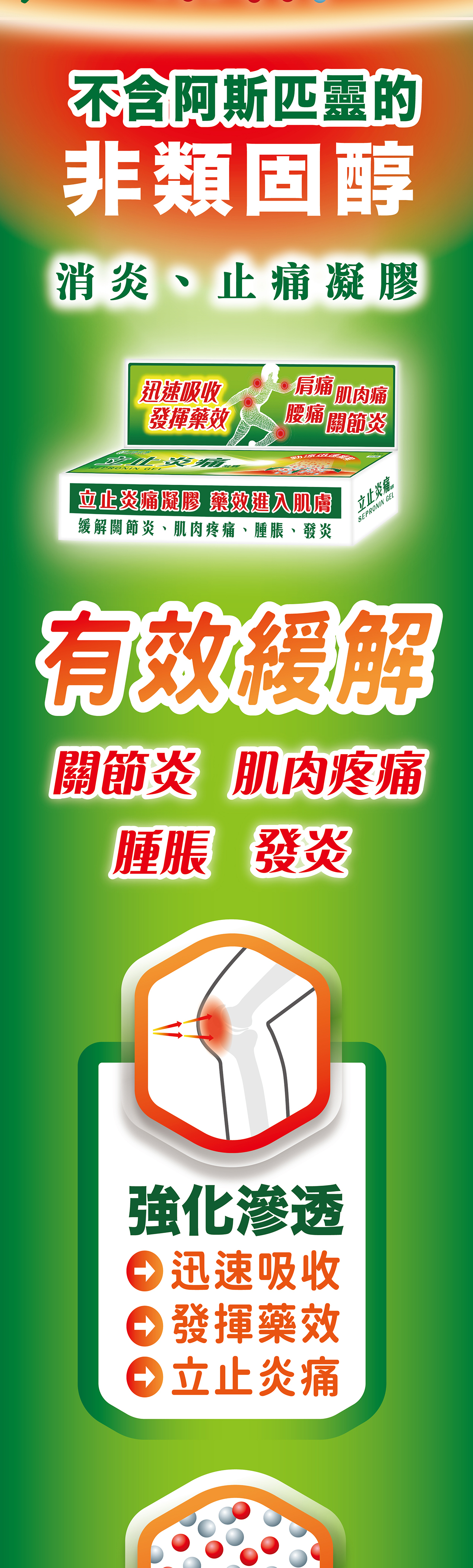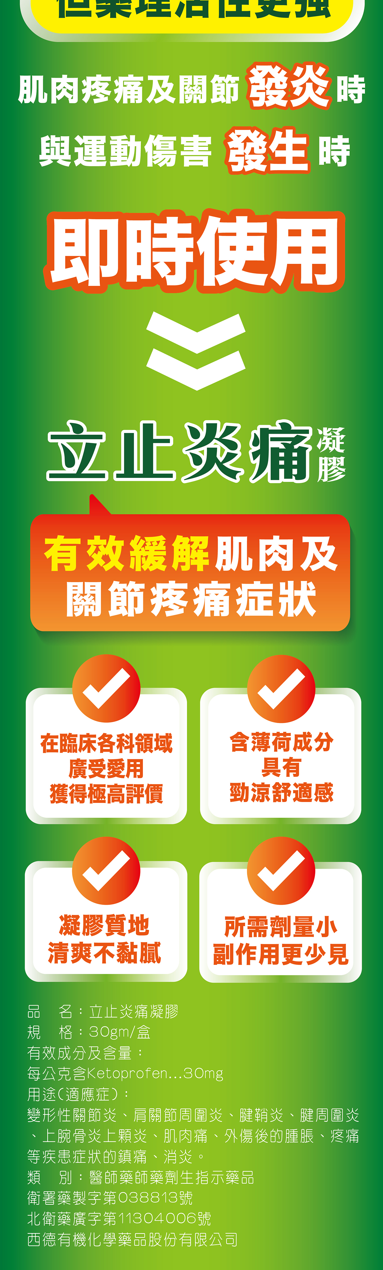 ·用途(適應症):變形性關節炎、肩關節周圍炎、腱鞘炎、腱周圍炎、上腕骨炎上顆炎、肌肉痛、外傷後的腫脹、疼痛等疾患症狀的鎮痛、消炎。