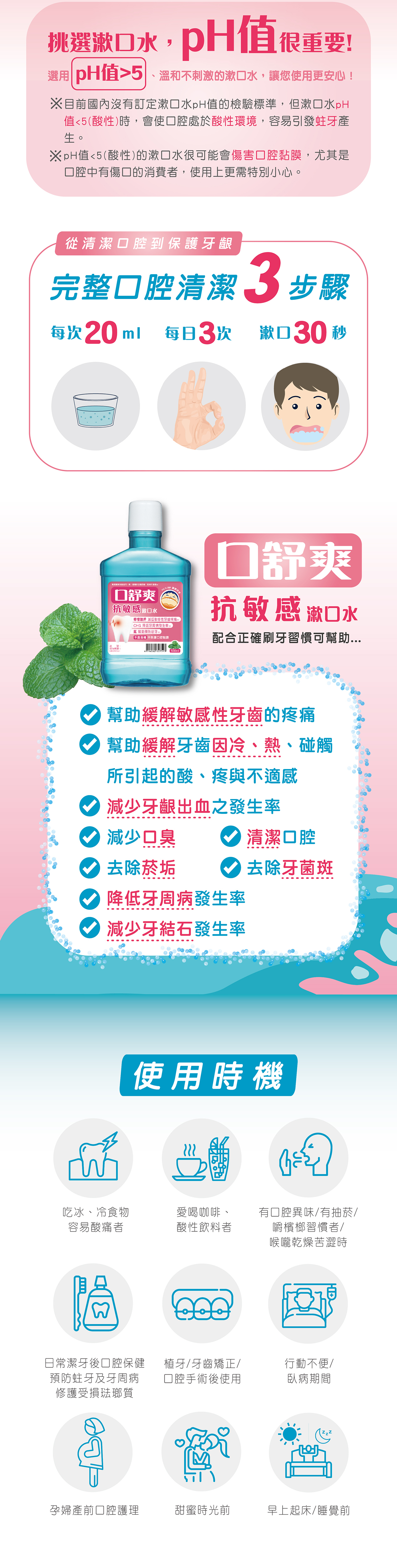 ‧每日2~3次,每次10~20ml,含於口內漱動30秒後吐掉。