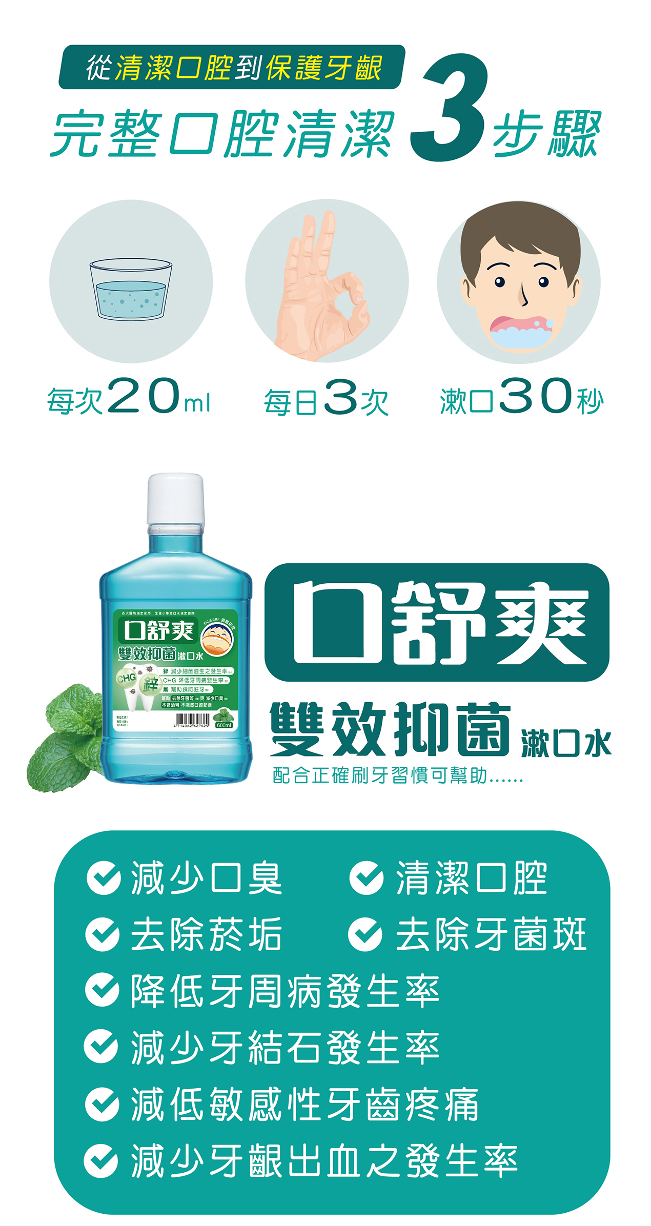 ‧每日2~3次,每次10~20ml,含於口內漱動30秒後吐掉。