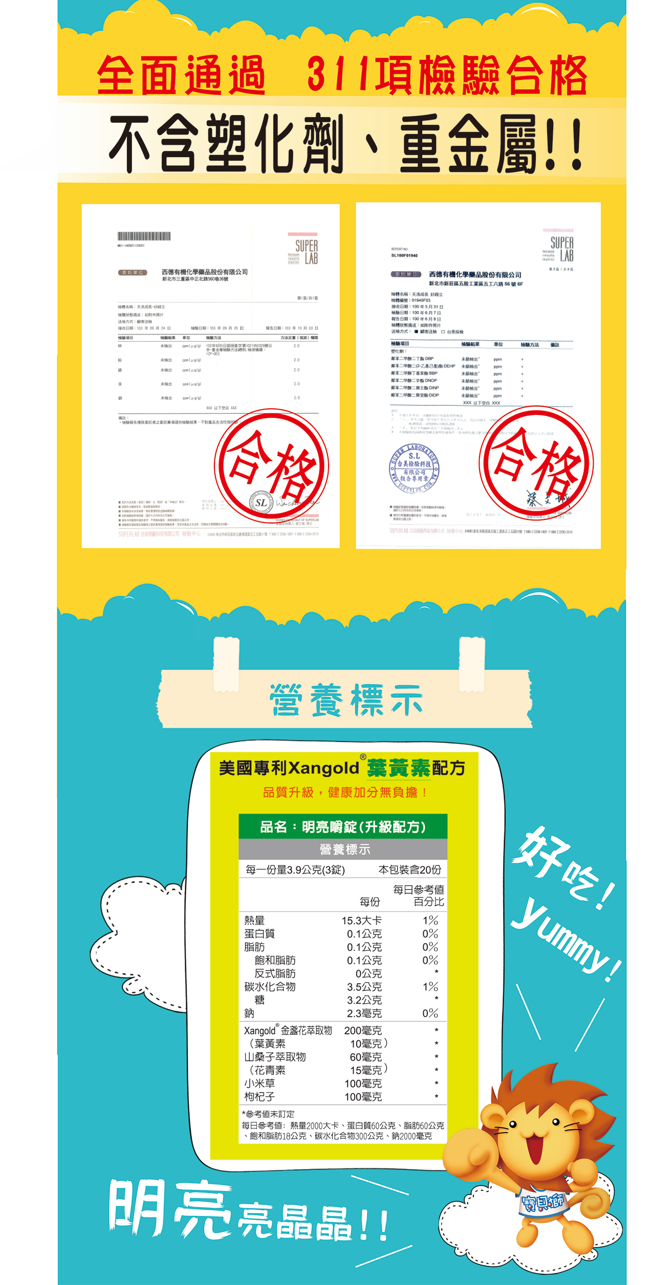 乳糖、砂糖、紅葡萄果汁粉【砂糖、紅葡萄果汁粉〔紅葡萄濃縮汁、麥芽糊精、黏稠劑(辛烯基丁二酸鈉澱粉〕〕、黏稠劑(辛烯基丁二酸鈉澱粉)、葡萄香料、調味劑(蘋果酸)、葡萄果皮色素、著色劑(焦糖色素)、調味劑(檸樣酸鈉、檸檬酸、酒石酸)】、Xango1d®金盞花萃取物(含葉黃素)、小米草、枸杞子、黏稠劑(羥丙基纖維素、山桑子萃取物(含花青素)、葡萄香料粉〔香料、品質改良用、釀造及食品製造劑(二氧化矽)、乳糖〕、品質改良用、造及食品製造劑(二氧化矽、硬脂酸鎂)、調味劑(蘋果酸)。