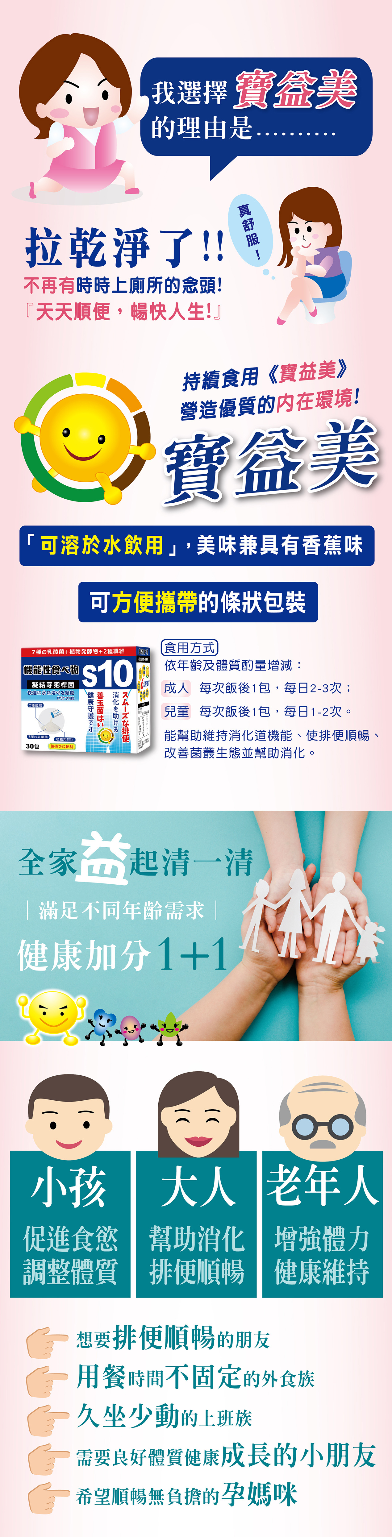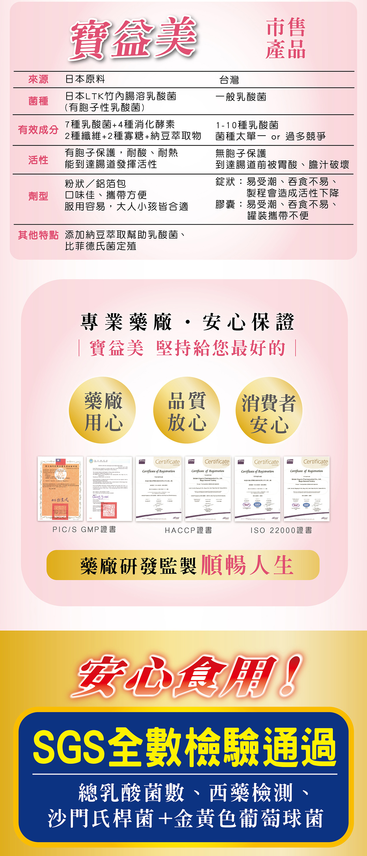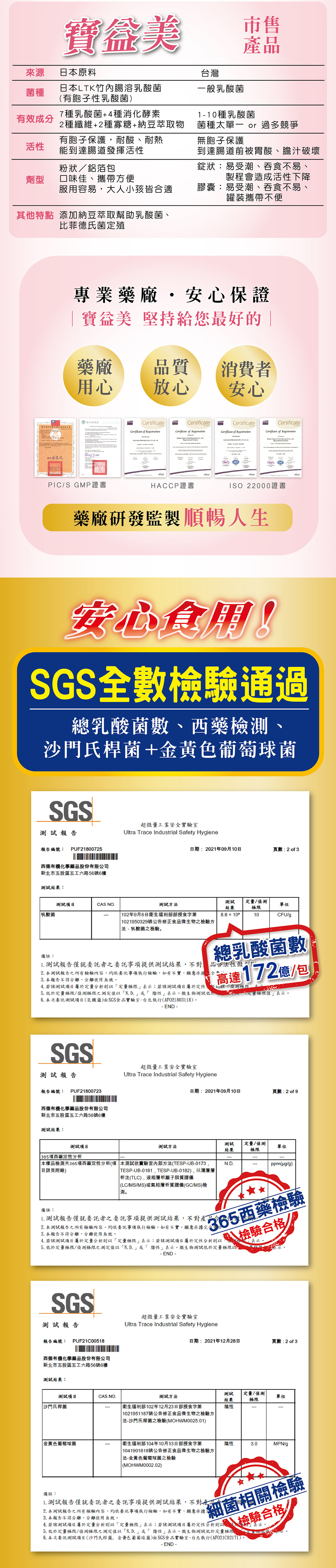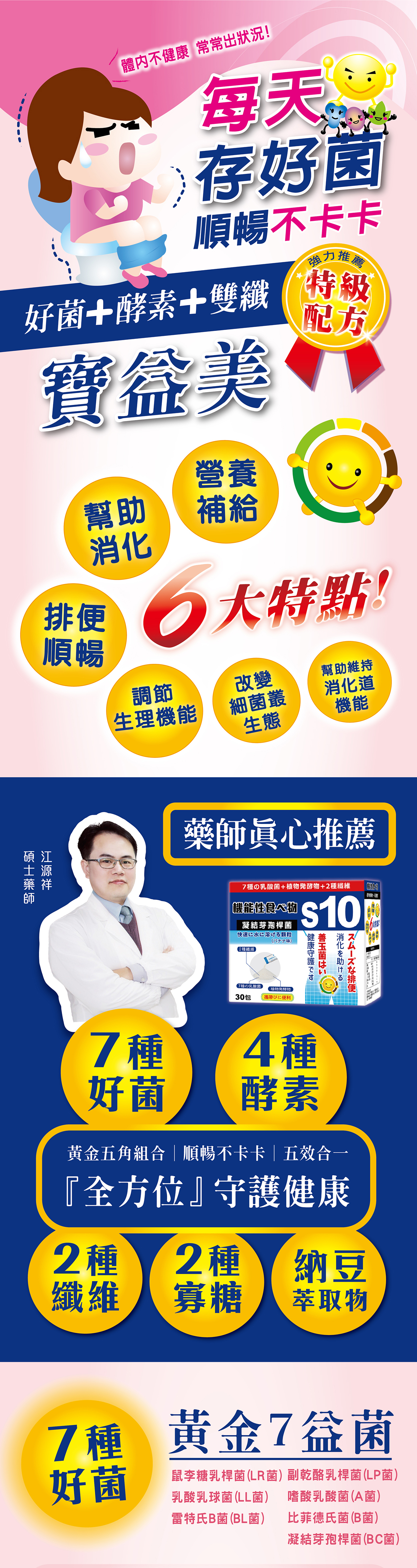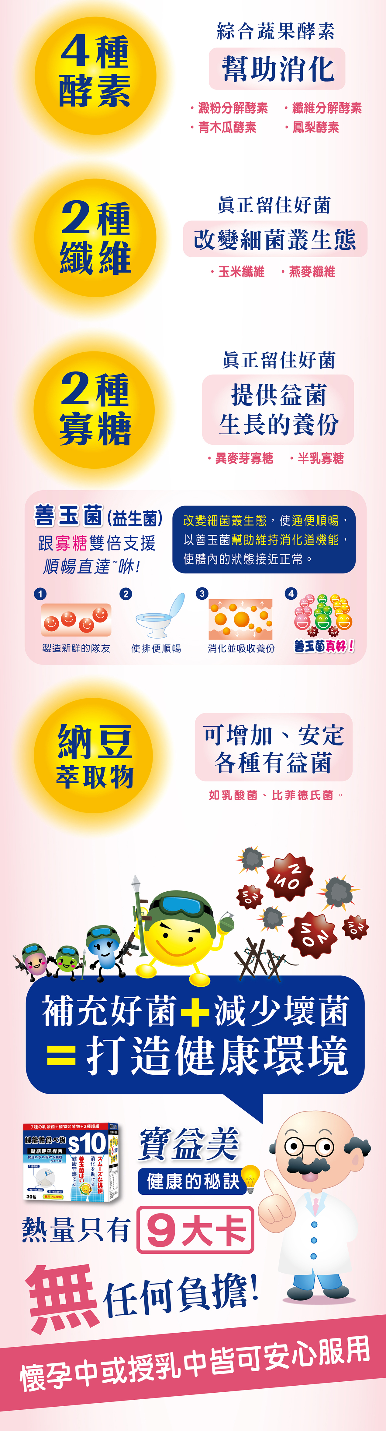 乳酸菌粉(乳糖、雷特氏B菌、鼠李糖乳桿菌、凝結芽孢桿菌、乳酸乳球菌)、赤藻糖醇(甜味劑)、玉米來源可溶性纖維、異麥芽寡糖、香蕉果汁粉【砂糖、麥芽糊精、香蕉泥、蘋果濃縮汁、檸檬酸、檸檬酸鈉、香料、維生素C(抗氧化劑)、β-胡蘿蔔素】、D-山梨醇(甜味劑)、燕麥纖維、玉米糖膠、LTK竹内腸溶乳酸菌(乳酸、麥芽糖、麥芽糊精、半乳寡糖、副乾酪乳桿菌、比菲德氏菌、嗜酸乳桿菌、凝結芽孢桿菌、葡萄柚果汁粉、普魯蘭膠、檸檬酸、DL-蘋果酸、香料)、青木瓜萃取、納豆發酵萃取、啤酒酵母、二氧化矽、香蕉香料、綜合蔬果抽出物(乳糖、鳳梨萃取物、澱粉分解酵素、纖維分解酵素、青木瓜酵素、麥芽糊精)、鳳梨萃取(含鳳梨酵素)