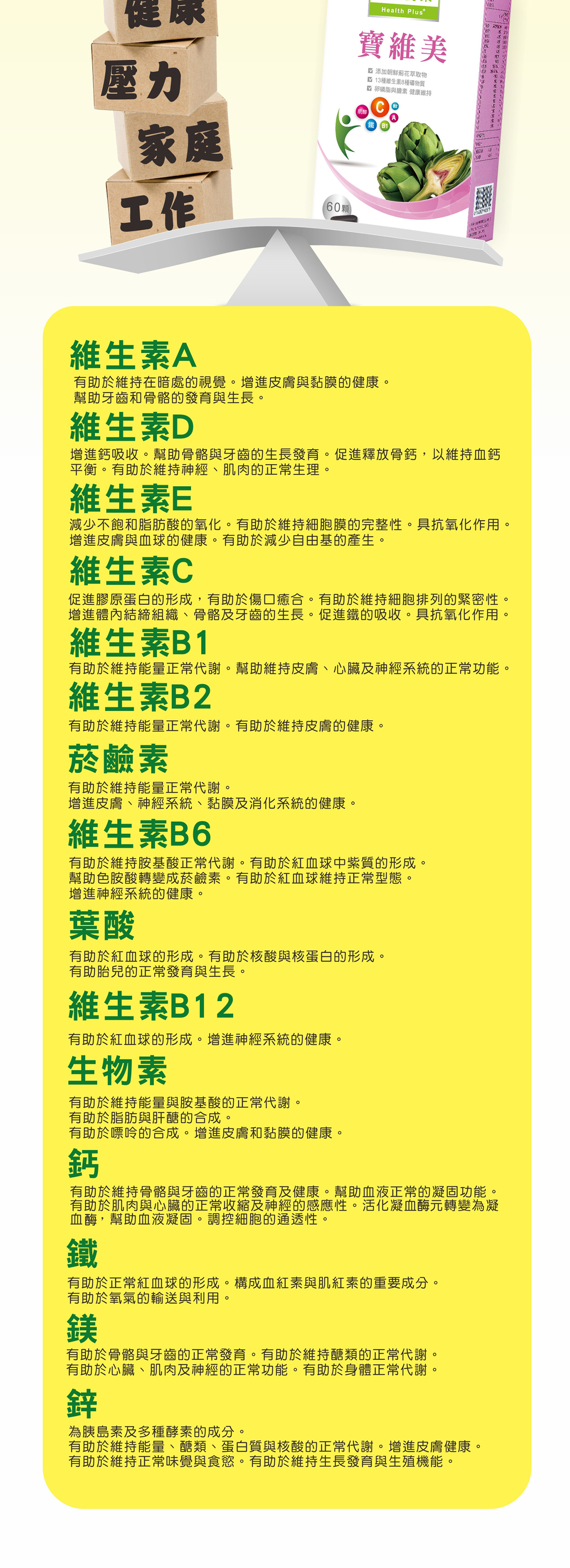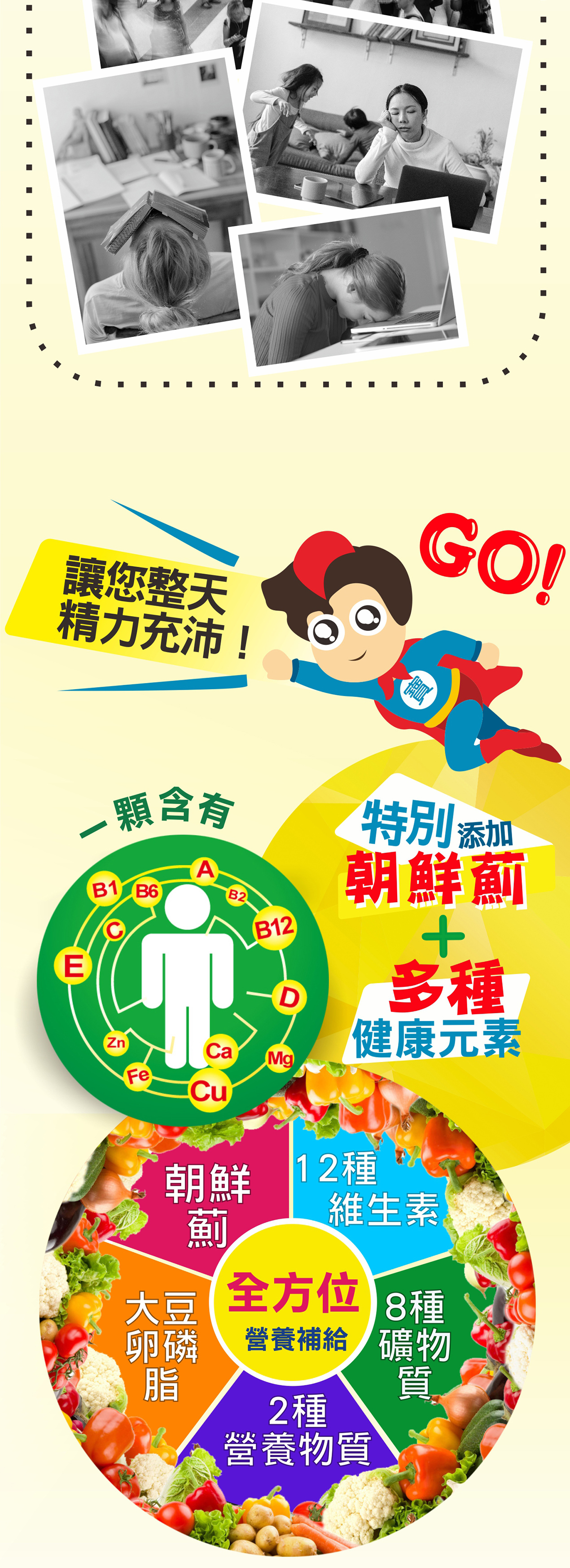維生素C(維生素C、羥丙基甲基纖維素)、維生素B2、維生素B6、本多酸鈣、重酒石酸膽鹼(重酒石酸膽鹼、二氧化矽)、肌醇、麥芽糊精、維生秦B1、朝鮮薊萃取物、維生素E(維生素E、辛烯基丁二酸鈉澱粉、麥芽糊精、二氧化矽)、菸鹼醯胺、維生素A醋酸鹽(麥芽糊精、阿拉伯膠、玉米澱粉、維生素A醋酸鹽、維素E)、磷酸鈣、硒酵母、鉻酵母、葡萄糖酸鋅、氧化鎂、大豆卵磷脂、焦磷酸鐵、維生素D3(維生素D3、維生素E、抗壞血酸鈉、中鏈三酸甘油酯、辛烯基丁二酸納澱粉、蔗糖、二氧化矽)、葡萄糖酸錳、葡萄糖酸銅、葉酸、維生素B12、生物素。