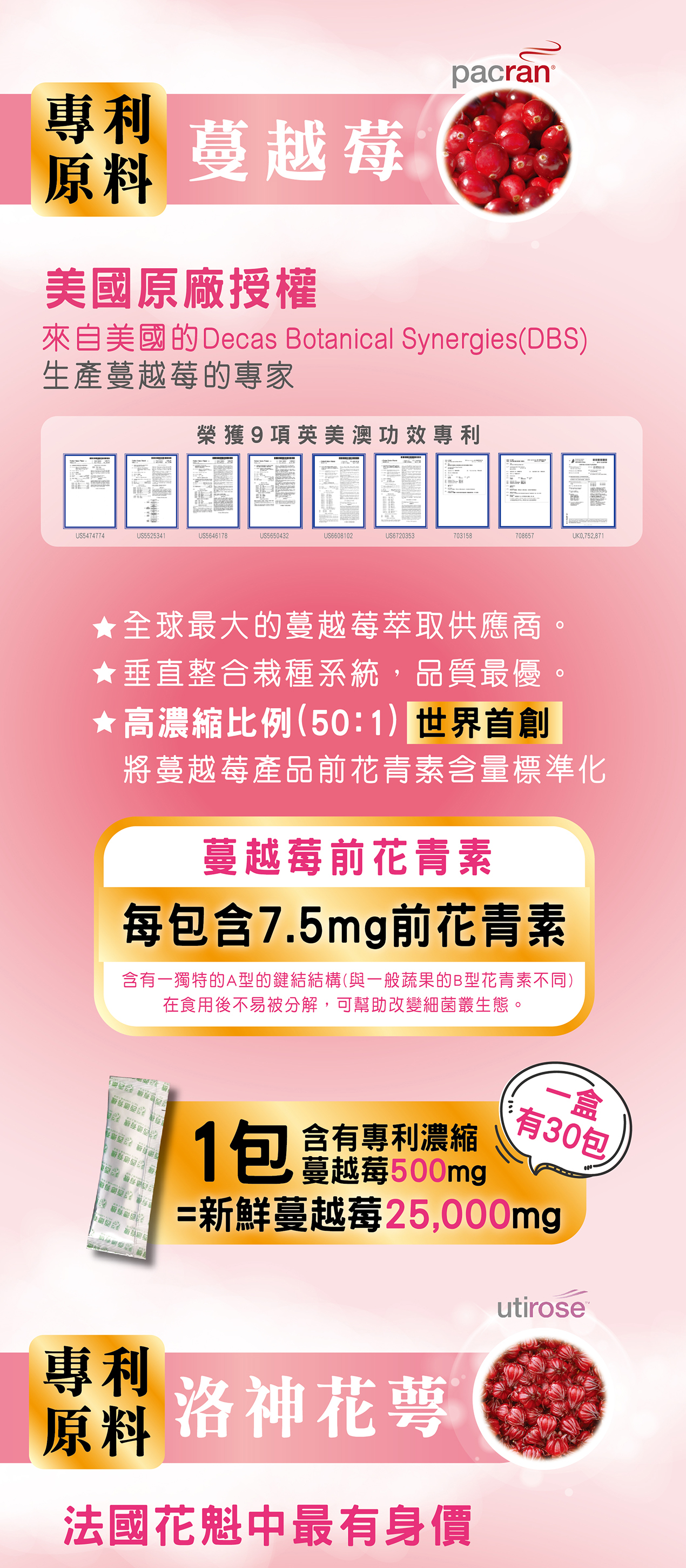 砂糖、Pacran蔓越莓萃取、即溶蔓越莓果汁粉【砂糖、蔓越莓果汁粉〔麥芽糊精、蔓越莓濃縮汁、葡萄汁色素、黏稠劑(辛烯基丁二酸鈉澱粉)、黑加侖濃縮汁〕、黏稠劑(辛烯基丁二酸鈉澱粉)、調味劑(檸檬酸、檸檬酸鈉)、玉米澱粉、調味劑(蘋果酸)、蔓越莓香料〔黏稠劑(辛烯基丁二酸鈉澱粉)、麥芽糊精、蔓越莓香料、β-環狀糊精、乳化劑(脂肪酸甘油酯)、抗氧化劑(維生素E)〕、著色劑〔β-胡蘿蔔素(麥芽糊精、中鏈三酸甘油酯、砂糖、阿拉伯膠、著色劑(β-胡蘿蔔素))〕、胭脂紅】、洛神花萼萃取(洛神花萼萃取、碳酸鈣)、蔓越莓果汁粉〔麥芽糊精、蔓越莓濃縮汁、葡萄汁色素、黏稠劑(辛烯基丁二酸鈉澱粉)、黑加侖濃縮汁、調味劑(檸檬酸)、蔓越莓香料〕、鼠李糖乳桿菌Lactobacillus rhamnosus(LR菌)、甜味劑(蔗糖素)。
