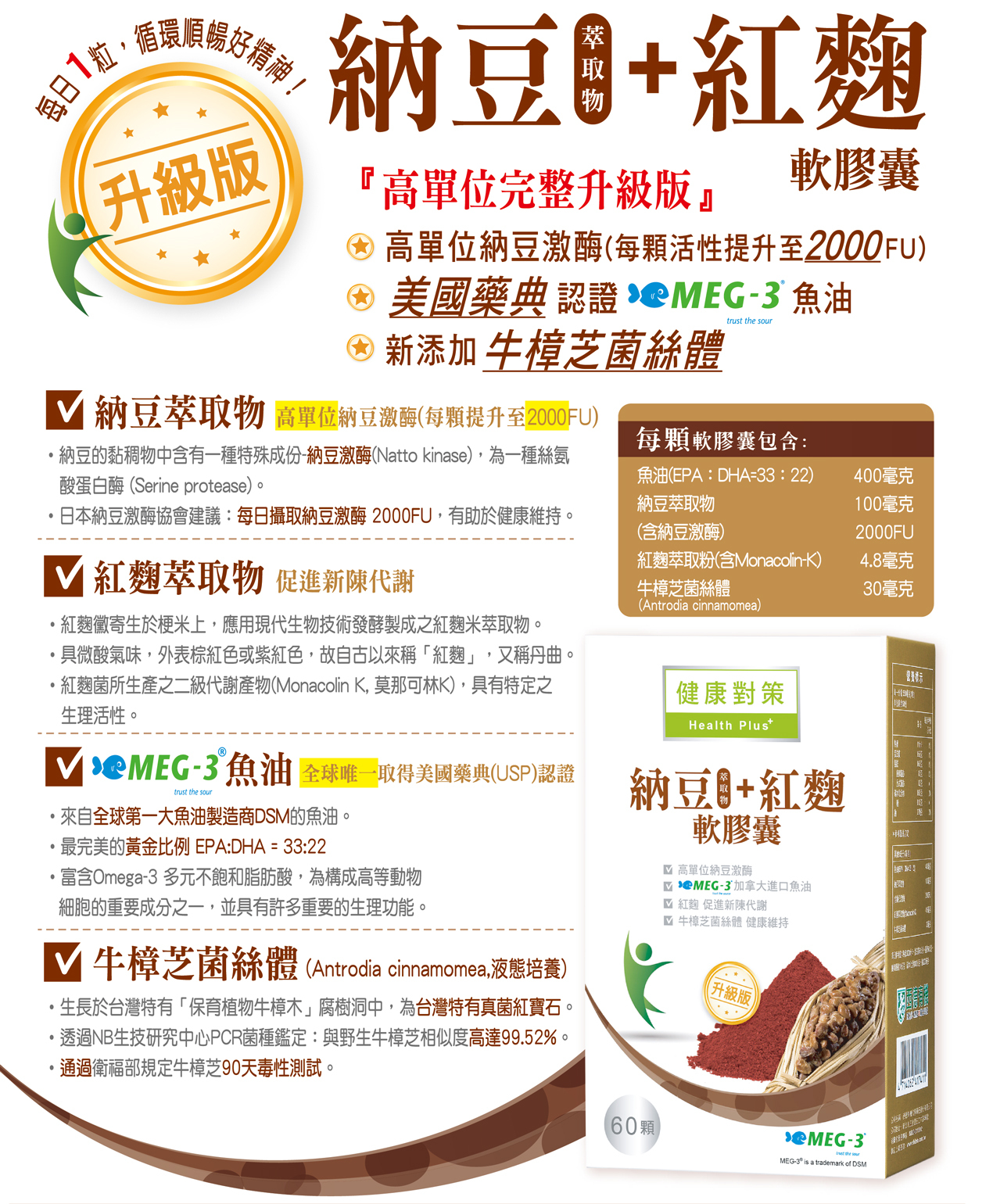 內容物:MEG-3®魚油(EPA:DHA-33:22)、納豆萃取物、牛樟芝菌絲體、乳化劑(脂肪酸甘油酯)、紅麴萃取物。
