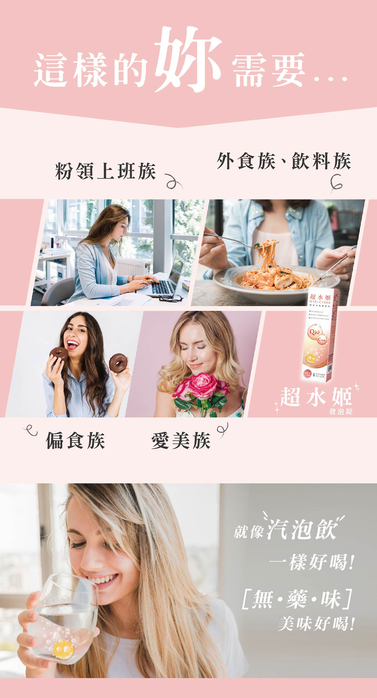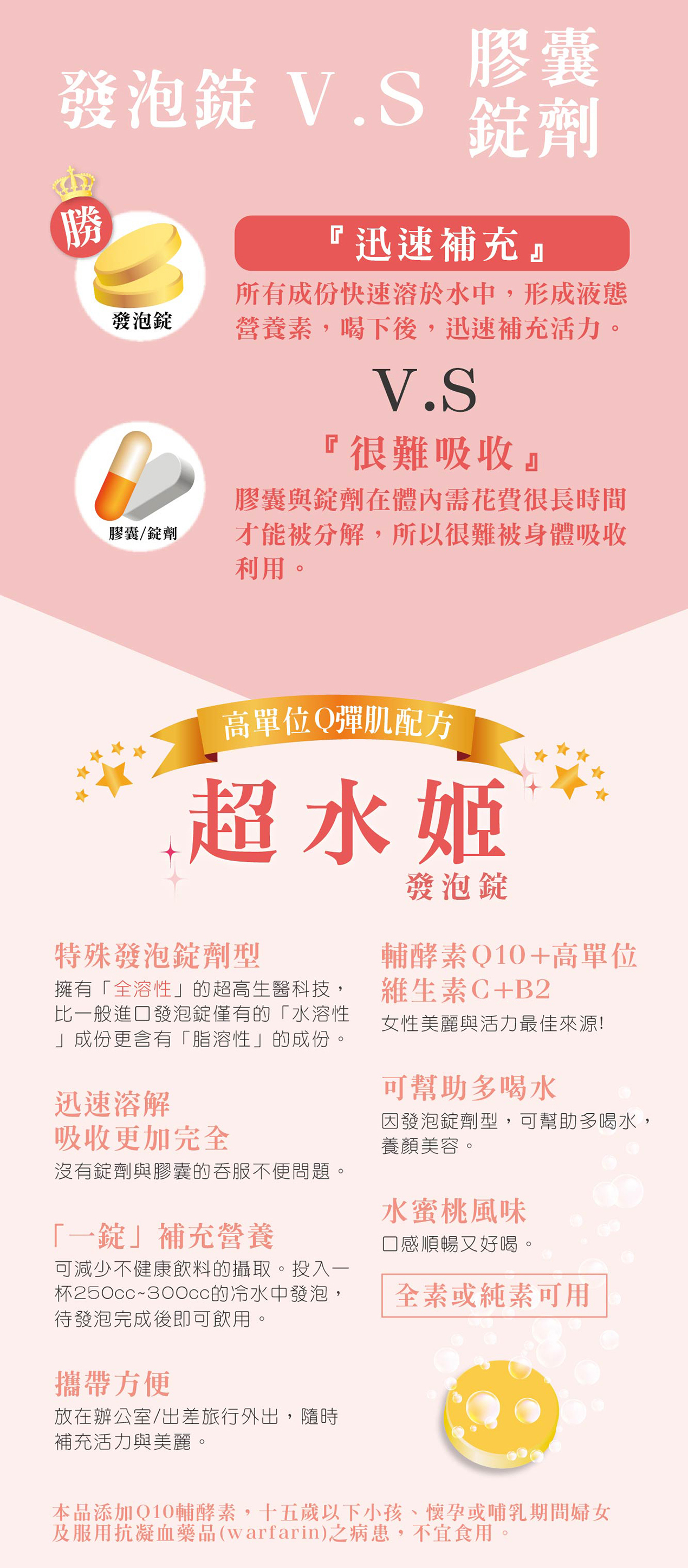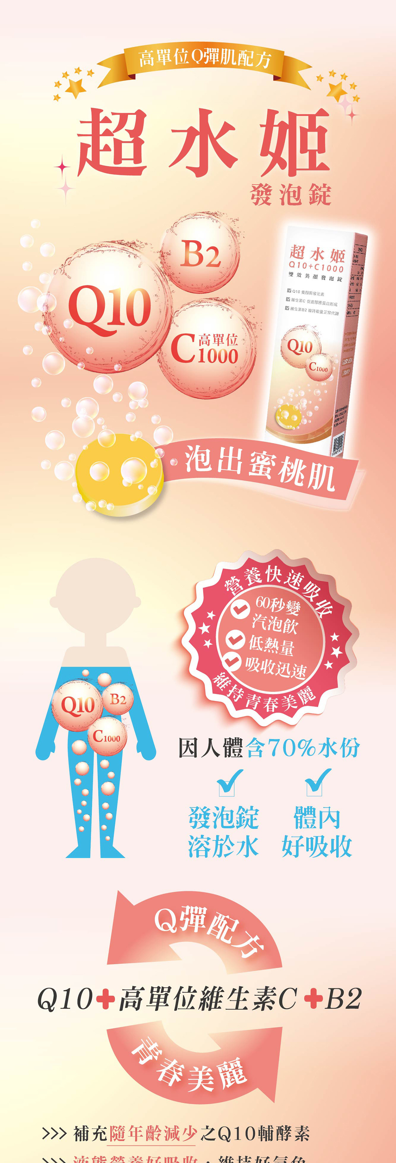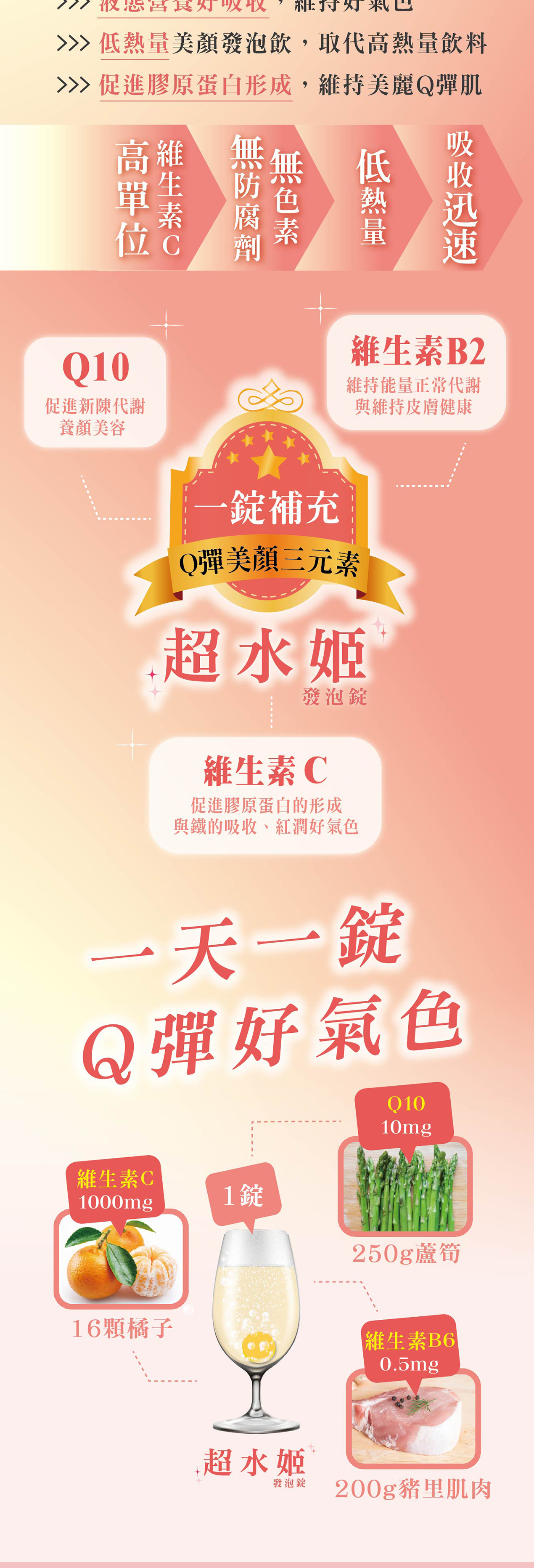 調味劑(檸檬酸)營養添加劑(維生素C)、甜味劑(甘露醇)膨脹劑(碳酸氫鈉)、水蜜桃果汁粉【水蜜桃濃縮汁、麥芽糊精、黏稠劑(辛烯基丁二酸鈉澱粉)、調味劑(檸檬酸)、橘子香料(含橘子油)、著色劑〔β-胡蘿蔔素(麥芽糊精、中鏈脂肪酸、砂糖、阿拉伯膠、著色劑〈β-胡蘿蔔素〉)〕、柳橙香料】、其他(聚乙二醇)、水蜜桃香料粉【麥芽糊精、黏稠劑(辛烯基丁二酸鈉澱粉)、水蜜桃香料、β-環狀糊精、乳化劑(脂肪酸甘油酯)、抗氧化劑(維生素E)】、乳化劑(羥丙基纖維素)、甜味劑(蔗糖素)、甜味劑(醋磺内酯鉀)、輔酵素Q10、營養添加劑(維生素B2)。