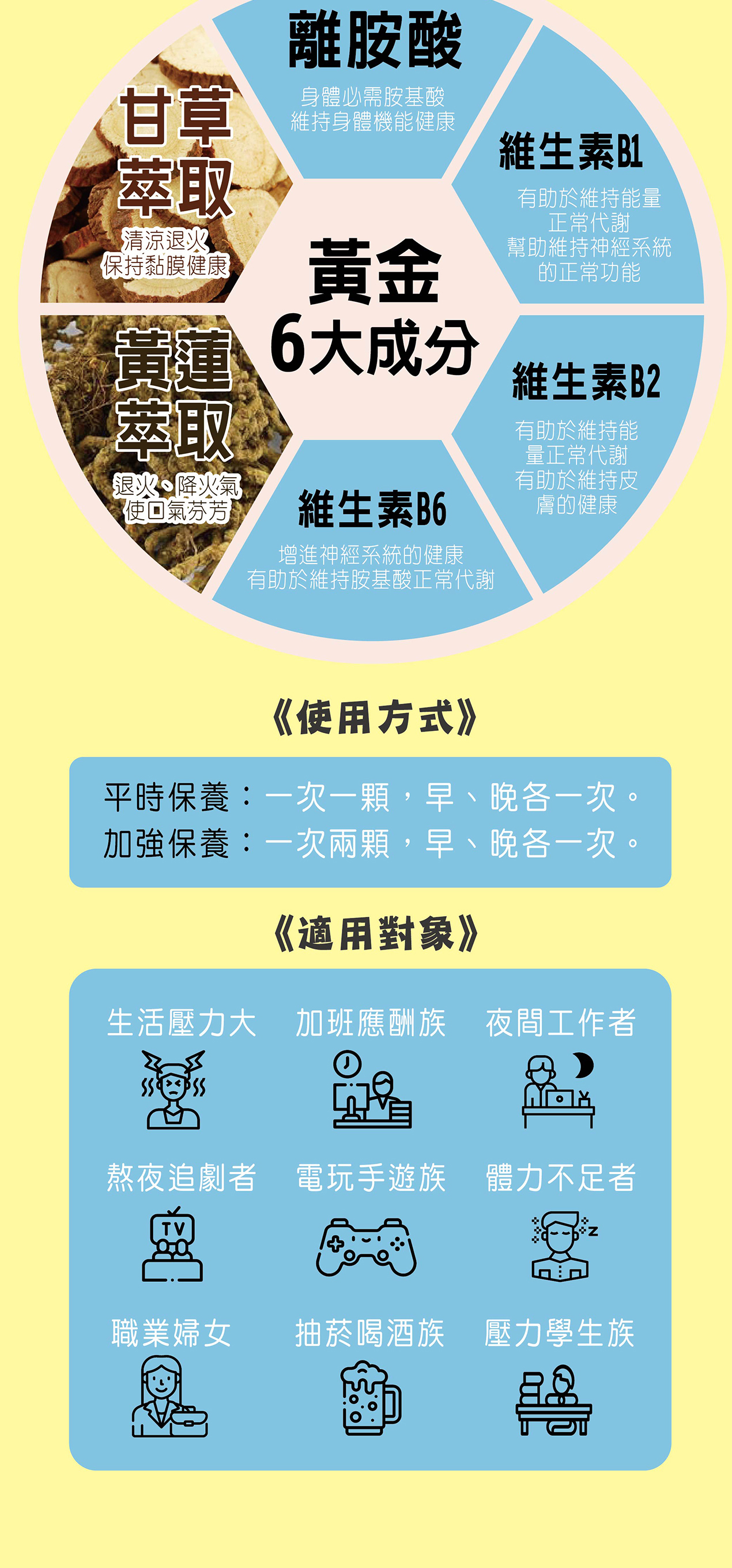 營養添加劑【鹽酸L-二胺基己酸(L-離胺酸)】、微結晶狀α-纖維素、營養添加劑【核黃素(維生素B2)、鹽酸吡哆辛(維生素B6)、硝酸硫胺明(維生素B1)】、甜味劑(甘草素)、黃連萃取粉(含麥芽糊精、品質改良用、釀造用及食品製造用劑(硬脂酸鎂、二氧化矽)。