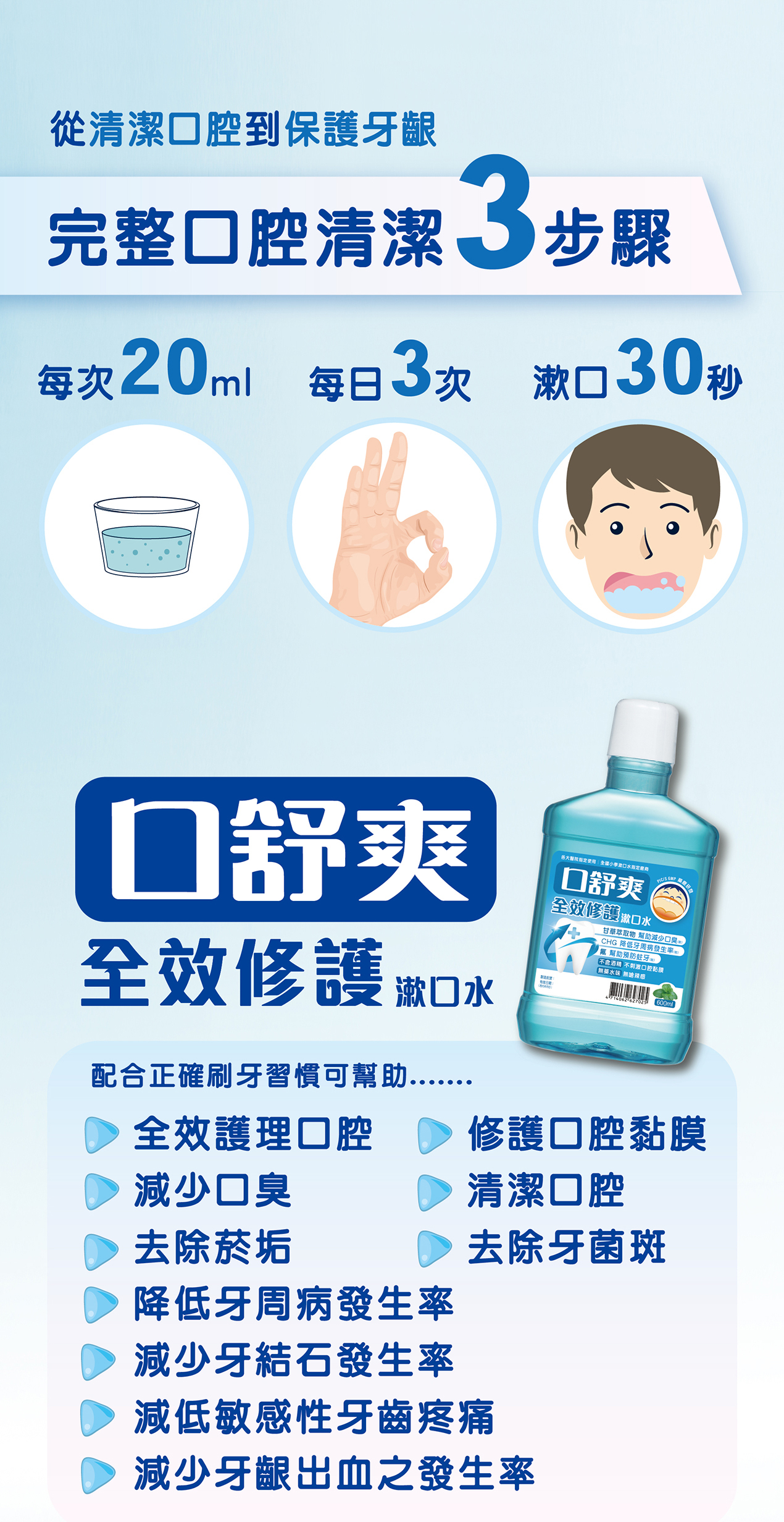 ‧每日2~3次,每次10~20ml,含於口內漱動30秒後吐掉。